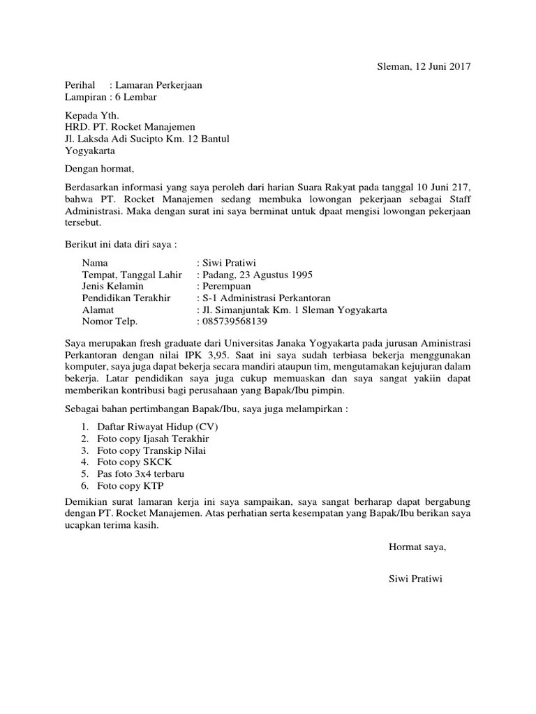 Kepada yth, manajer hrd pt. Download contoh surat lamaran kerja fresh graduate bisa dibilang yang paling banyak diminati oleh beberap perusahaan untuk direkrut sebagai karyawan . Tentunya, dengan berbekal pengalaman ataupun fresh graduate kita sebagai manusia akan mengharapkan sebuah pekerjaan yang layak dan tentunya bisa . Surat lamaran kerja berfungsi sebagai dokumen pernyataan diri, untuk melamar suatu posisi pekerjaan kepada orang atau perusahaan. Untuk fresh graduate bisa mengganti daftar dokumen yang dilampirkan .